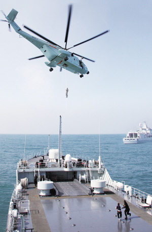 2008年2月10日,南海舰队航空兵某直升机团与舰艇、特种部队在海上进行联合反恐演练。