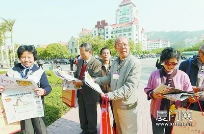 昨日8时起,2000份《厦门日报》特刊,在厦大南校门、西校门、科艺中心和建南大会堂等地发放,本报发行人员举着特制的“《厦门日报》恭祝厦门大学90周年校庆”的牌子,吸引了不少返校参加庆典的校友,一个小时左右,所有报纸就发完了。