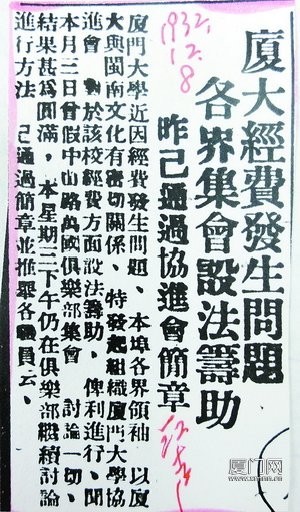 1932年12月8日,《江声报》发表题为《厦大经费发生问题各界集会设法筹助》的报道。