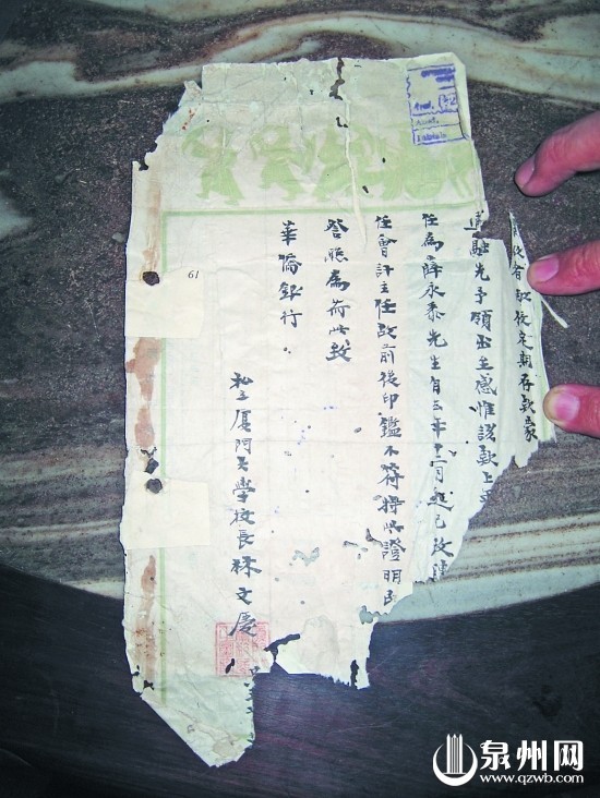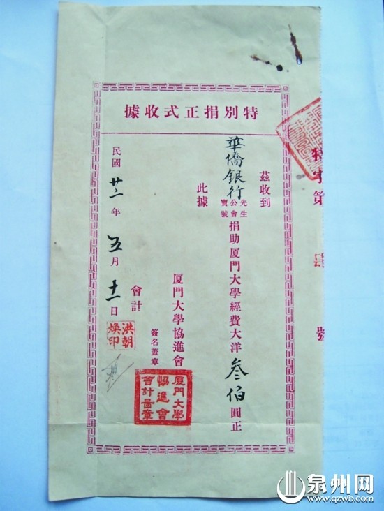 厦门大学90周年华诞之际,福建省钱币协会会员陈亚元先生拿出自己收藏的三张泛黄甚至有些破损的旧时收据和证明,它们见证了厦门大学与华侨银行非同一般的关系以及华侨银行曾经热心捐助厦门大学办学的义举。