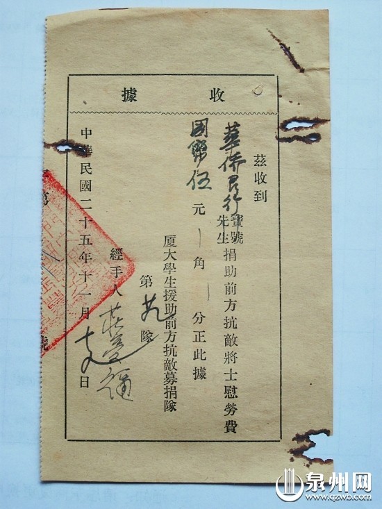 第二张收据落款时间为民国二十五年11月19日,内容是关于收到华侨银行捐助前方抗敌将士慰劳费国币伍元,落款单位是“厦大学生援助前方抗敌募捐队”第二十九队。