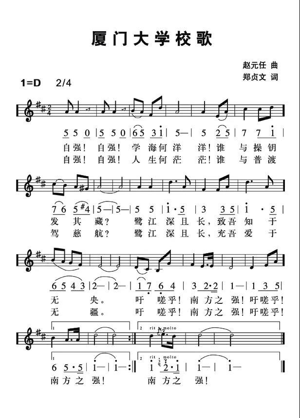 1921年4月6日,伴随着这曲旋律激昂、催人向上的厦大校歌,厦门大学开校仪式隆重举行。校歌以厦大“自强”的校训精神为主要思想内容,由出生于天津的现代著名学者、语言学家、音乐家赵元任谱曲,是中国早期大学校歌中少有的以西式音乐为主要旋律的歌曲,也开启了赵元任为国内高校谱写校歌的先河。