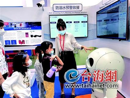 在罗普特展位上,一系列防溺水设备,吸引了几位小学生,工作人员正热心地向他们介绍防溺水预警救援系统。
