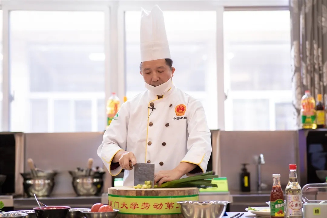 在厨艺课上,同学们跟着来自厦门大学后勤集团的大厨们,学习烹饪糖醋肉和海蛎煎
