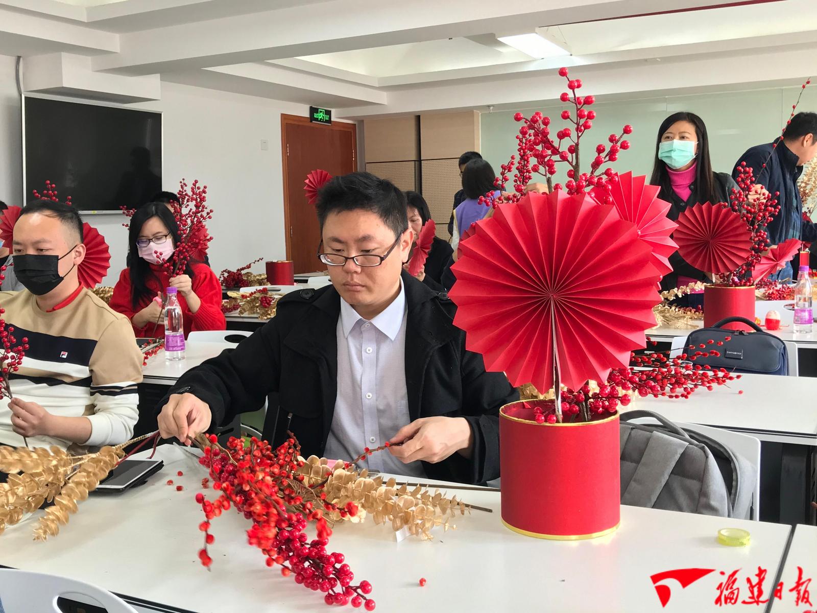 “现在可以把银柳插入瓶中,注意错落有致地摆放……”跟着花艺老师的讲解,台籍教师邱亦睿摆弄着桌上的花材,一盆火红喜庆的花艺作品逐渐成形。