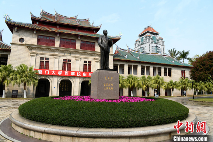图为4月1日拍摄的厦门大学里的陈嘉庚雕塑以及群贤楼群。 中新社记者 王东明 摄