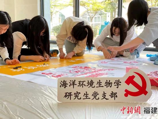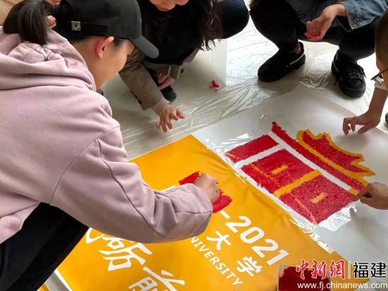 学生党员和积极分子以手指印画制作厦大百年校庆LOGO。