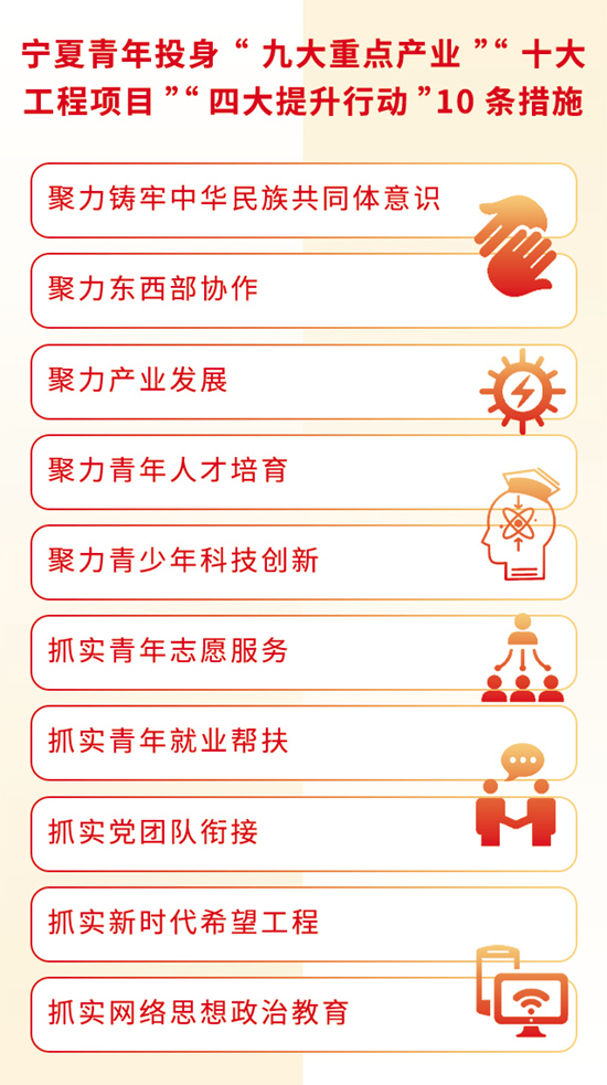 落实《共青团深入学习贯彻党的十九届五中全会精神 在全面建设社会主义现代化国家新征程中组织动员广大团员青年建功立业的行动纲要》的同时,团宁夏区委结合青少年党史学习教育,制定了《全区青年投身“九大重点产业”“十大工程项目”“四大提升行动”十项措施》,积极开展“五聚力五抓实”工作(见图表)。