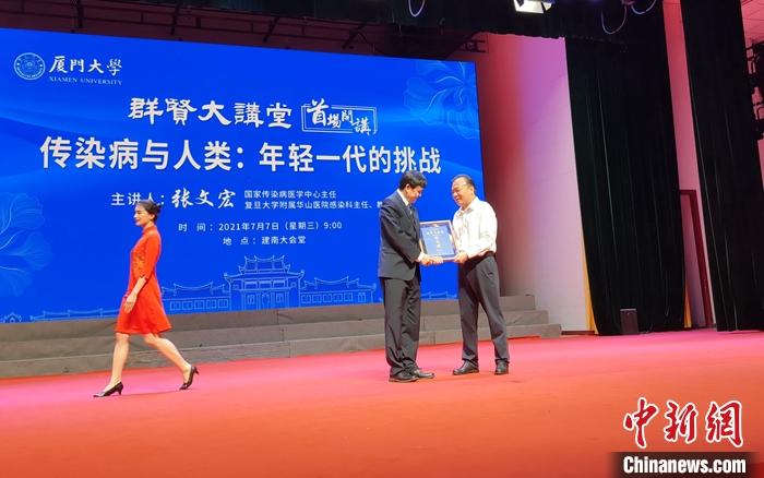 7月7日,厦门大学推出全新品牌系列讲座——“群贤大讲堂”,中国知名防疫专家、被誉为“硬核医生”的张文宏领衔开讲,发表《传染病与人类:年轻一代的挑战》为题的演讲,并与厦大师生展开零距离互动。 杨伏山 摄
