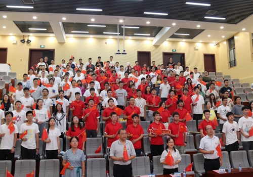 在由44位同学拼成的党徽下,现场师生共同挥舞起手中的红旗,用最响亮的声音为中国共产党百年华诞送上最真挚的祝愿。