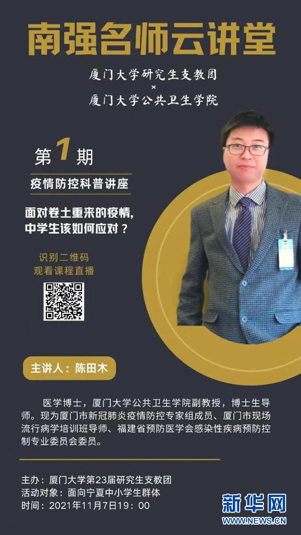 11月7日晚,在厦门大学研究生支教团的支教所在地——宁夏固原市隆德县和彭阳县以及中卫市海原县,9700多名中小学生同上一堂课:来自厦门大学公共卫生学院的陈田木副教授通过云端平台为宁夏师生带来了一堂别开生面的疫情防控科普讲座。