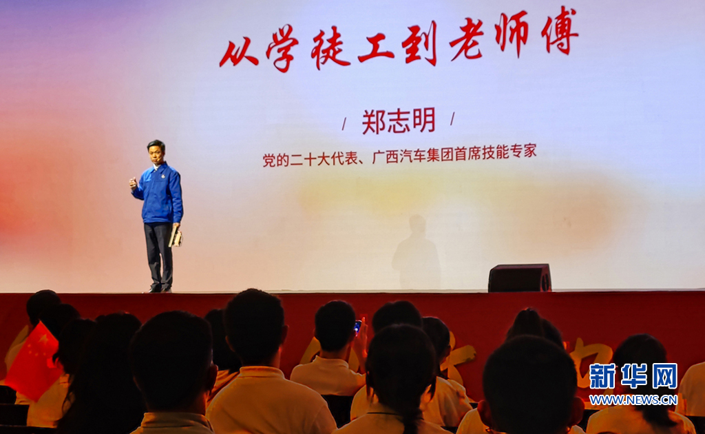 广西汽车集团首席技能专家郑志明讲述自己从学徒工到老师傅的心路历程,与在座的青年共勉。新华网 刘默涵 摄