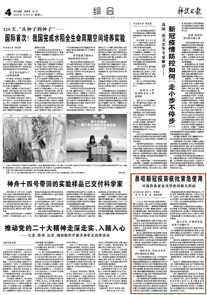 经过努力,“鼻喷新冠疫苗”陆续完成了国内I期、Ⅱ期和拓展临床试验,海外Ⅲ期临床试验也于今年10月7日揭盲,并在11月11日、11月25日分别参加国家相关部门组织的新冠疫苗视频论证会后获批紧急使用。