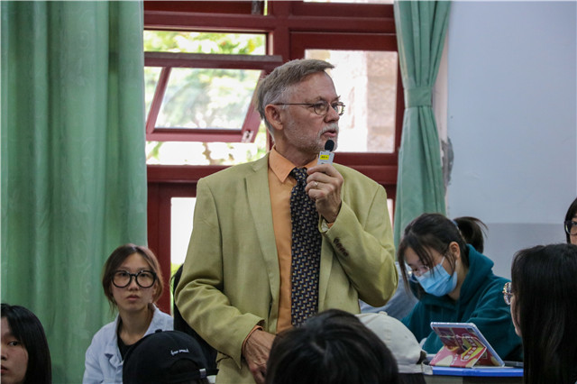 “你们看,1994年是土色,2019年是绿色!在宁夏,25年前我看到的破旧土房如今换成崭新的砖瓦房,绿化也很好!”课堂上,潘维廉以“中国改革开放给世界的启示”为主题,用幽默诙谐的语言分享了他在中国工作、生活的经历,来讲述改革开放后,我国社会主义建设取得的伟大成就,讲述什么是“中国梦”,讲述自己心中的“中国梦”。