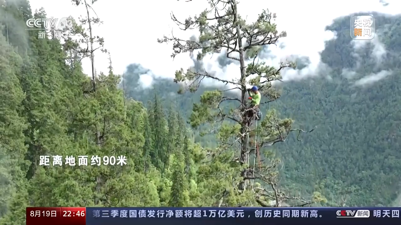随着高度的上升,风声变大、呼吸节律也同样增快,逐渐考验着领攀师的体力和耐力。历时两个多小时,郑达雄完成了藏南柏木2号的领攀任务,后经科学测量,这棵巨树高99.5米,相当于30层楼。领攀师郑达雄,也成了第一位踏上这棵巨树顶部人类。
