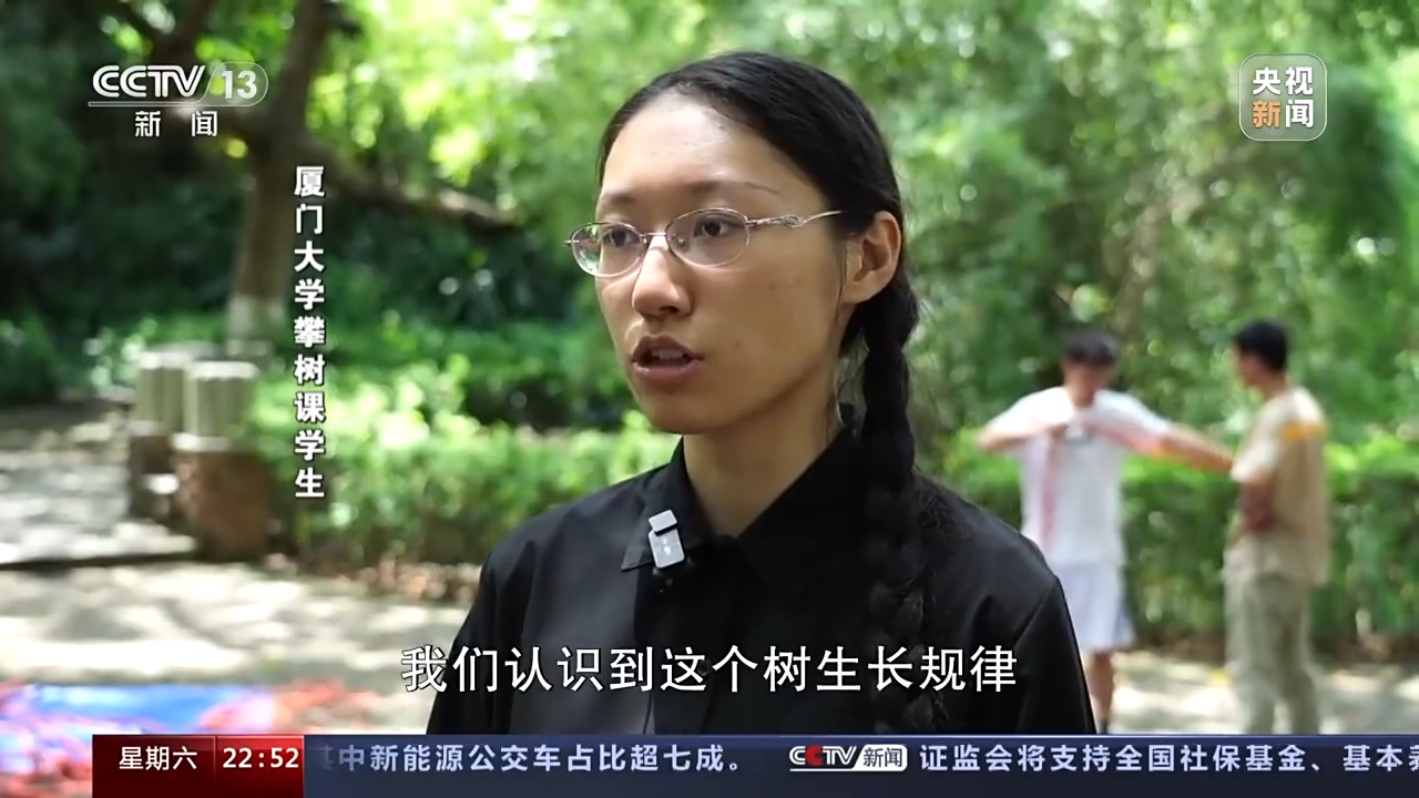 厦门大学攀树课学生:在以前我们认为树木保护就是我们把它围起来,不要让人去踩踏它,不要乱砍滥伐,这是第一层的保护。第二层的保护,我们认识到这个树木生长的规律,生态系统的循环,我们给它构建一个和谐的环境。