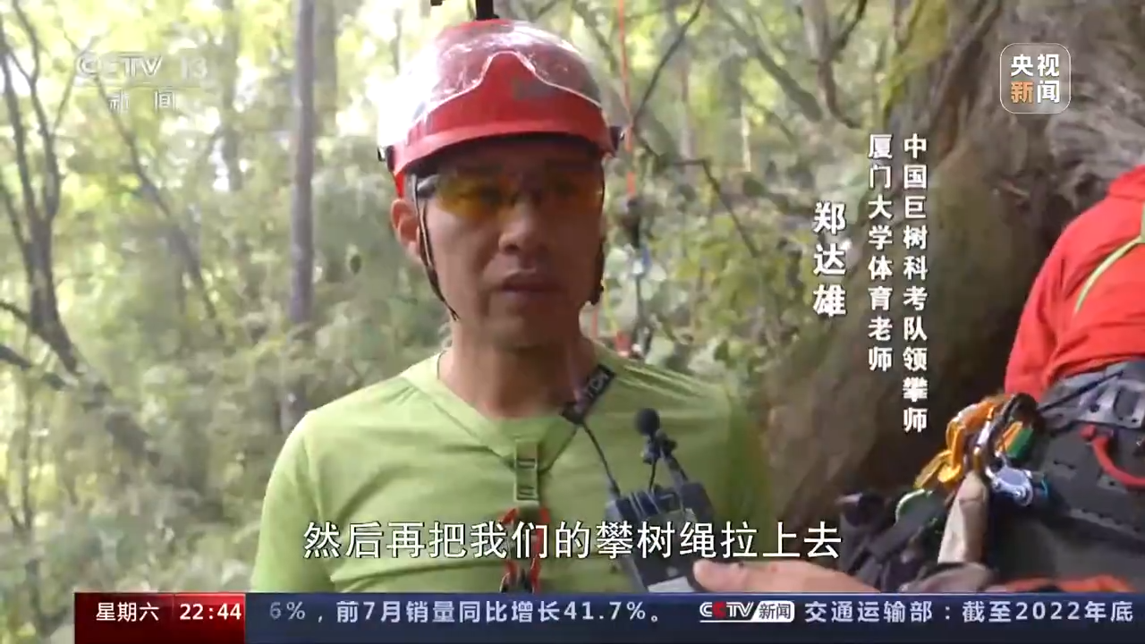 中国巨树科考队领攀师、厦门大学体育老师 郑达雄:我们考虑树木的安全和人的安全,我们用到了弹弓和豆袋绳,打到我们安全的枝丫上面,然后再把我们的攀树绳拉上去。