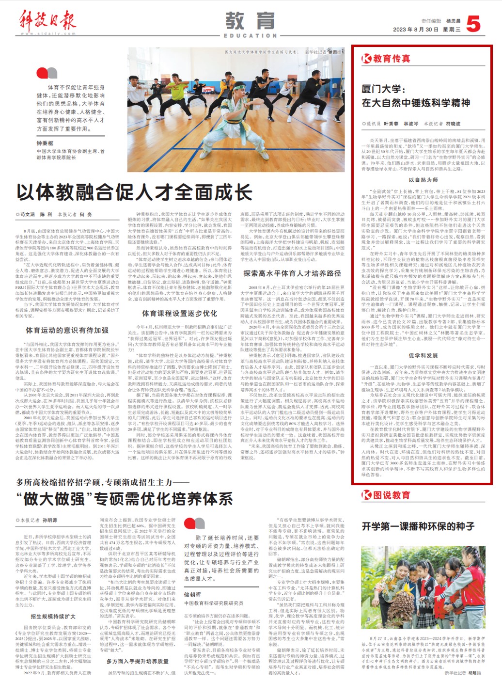 为培养在社会主义现代化建设中可堪大用、能担重任的栋梁之才,该学院积极探索实践德智体美劳“五育”并举的课程理念,跨学科、跨专业组建教学指导团队,在野外实习过程中,联合体育教学部开设攀树、野外生存等户外体育课程,使学生习得运动技能,增强勇气和意志力;联合创意与创新学院师生对采集的标本进行美化设计,使学生感受科学与艺术融合之美。