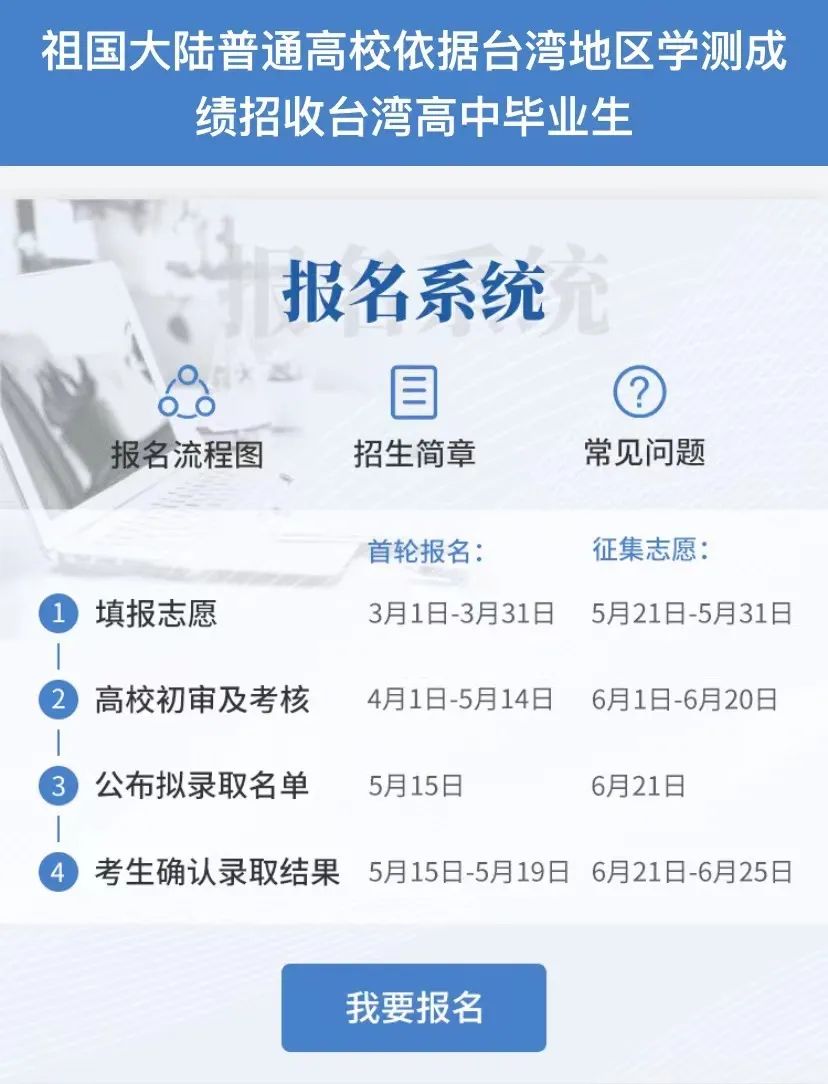 据了解,今年教育部面向台湾“学测生”采用统一的新的招生系统,并创新设计了“首轮报名录取+征集志愿”两轮招录功能,也就是有录取阶段和补录取阶段。报名时间为3月1日至3月31日,补录报名时间为5月21日至31日。具体信息请登录“内地(祖国大陆)高校面向港澳台地区招生信息网”(网址:https://www.gatzs.com.cn)。