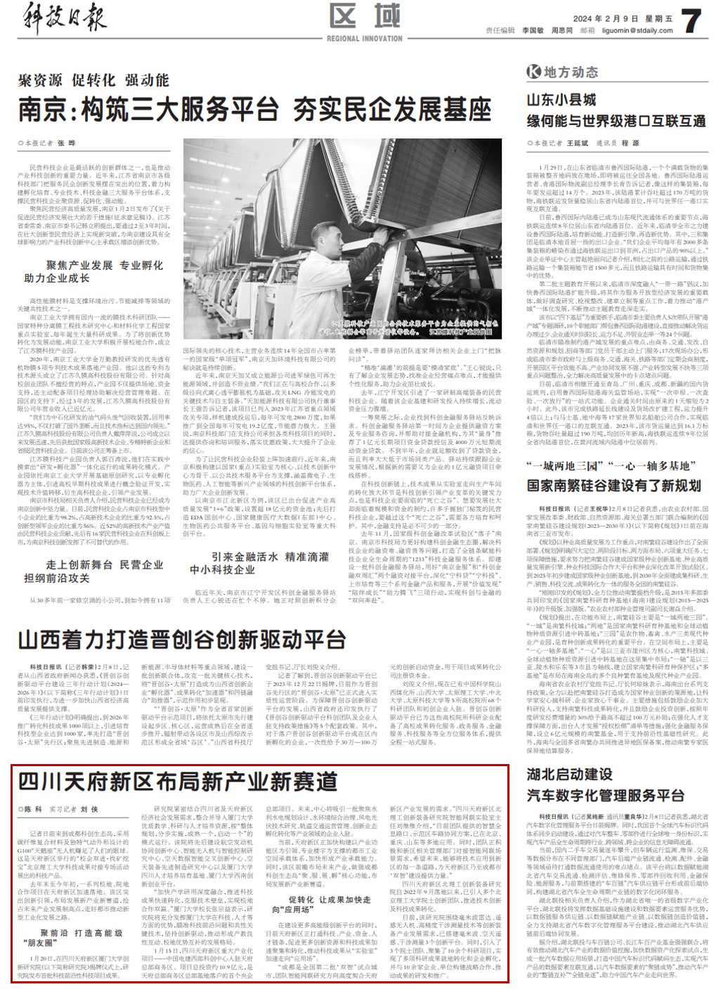 去年末至今年初,一系列校地、院地合作项目在天府新区加速落地。该区突出创新引领,布局发展新产业新赛道,抢占未来产业发展制高点,走好都市推动新型工业化发展之路。