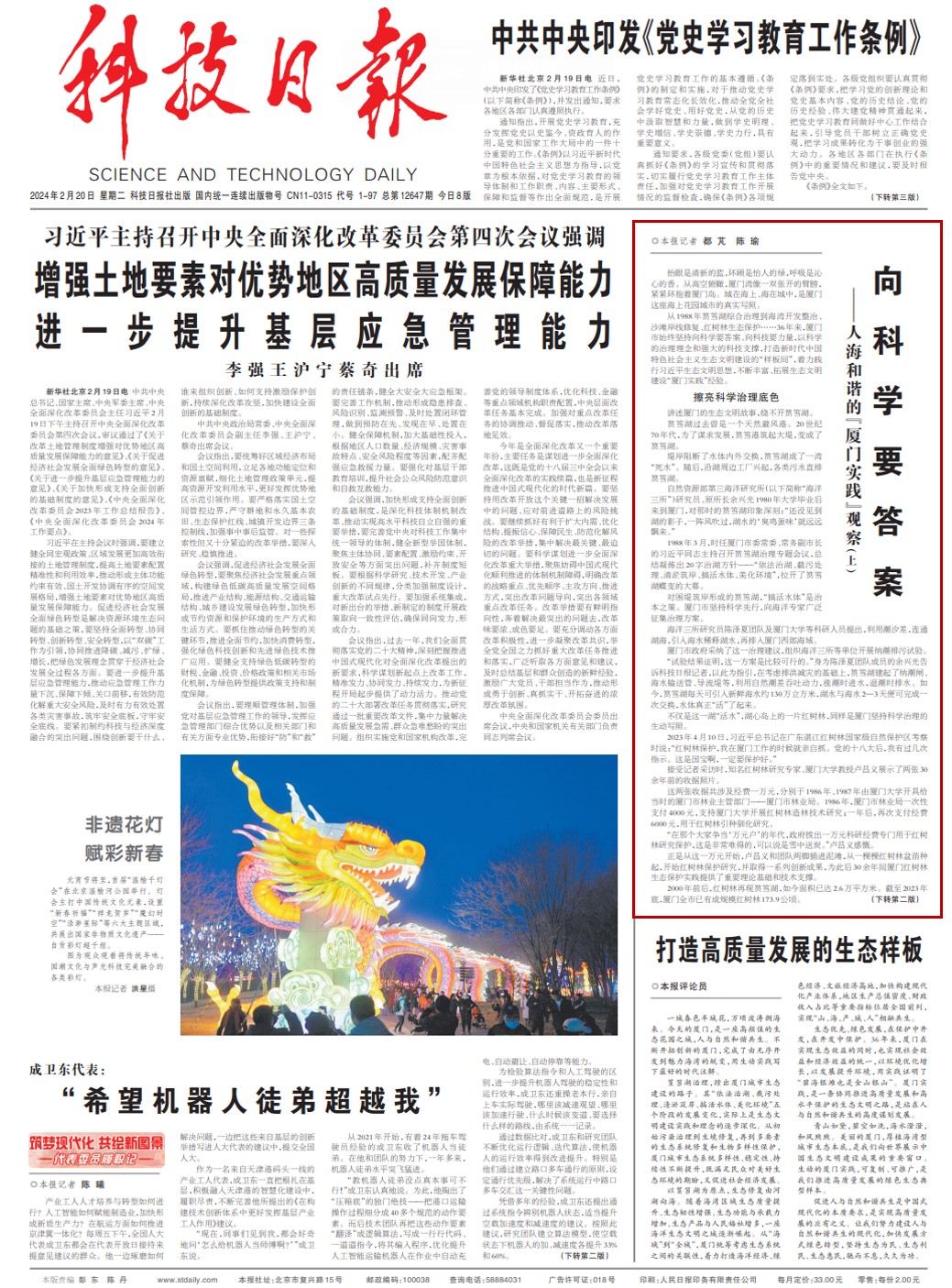从1988年筼筜湖综合治理到海湾开发整治、沙滩岸线修复、红树林生态保护……36年来,厦门市始终坚持向科学要答案、向科技要力量,以科学的治理理念和强大的科技支撑,打造新时代中国特色社会主义生态文明建设的“样板间”,着力践行习近平生态文明思想,不断丰富、拓展生态文明建设“厦门实践”经验。