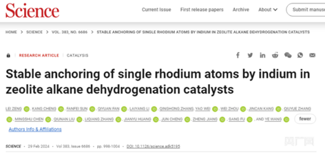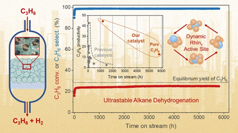 厦门大学化学化工学院、固体表面物理化学国家重点实验室王野教授、傅钢教授和上海光源姜政研究员(现中国科学技术大学教授)等,利用铟元素在反应条件下的动态迁移特性和铑单原子的高效C-H键活化能力,创制出5500小时以上寿命的超高稳定性In/Rh@S-1催化剂,在近热力学平衡收率条件下高选择性催化丙烷等低碳烷烃直接脱氢制取对应烯烃。相关成果以“Stable anchoring of single rhodium atoms by indium in zeolite alkane dehydrogenation catalysts”为题于2024年3月1日发表在Science期刊(2024,383,998-1004)。
