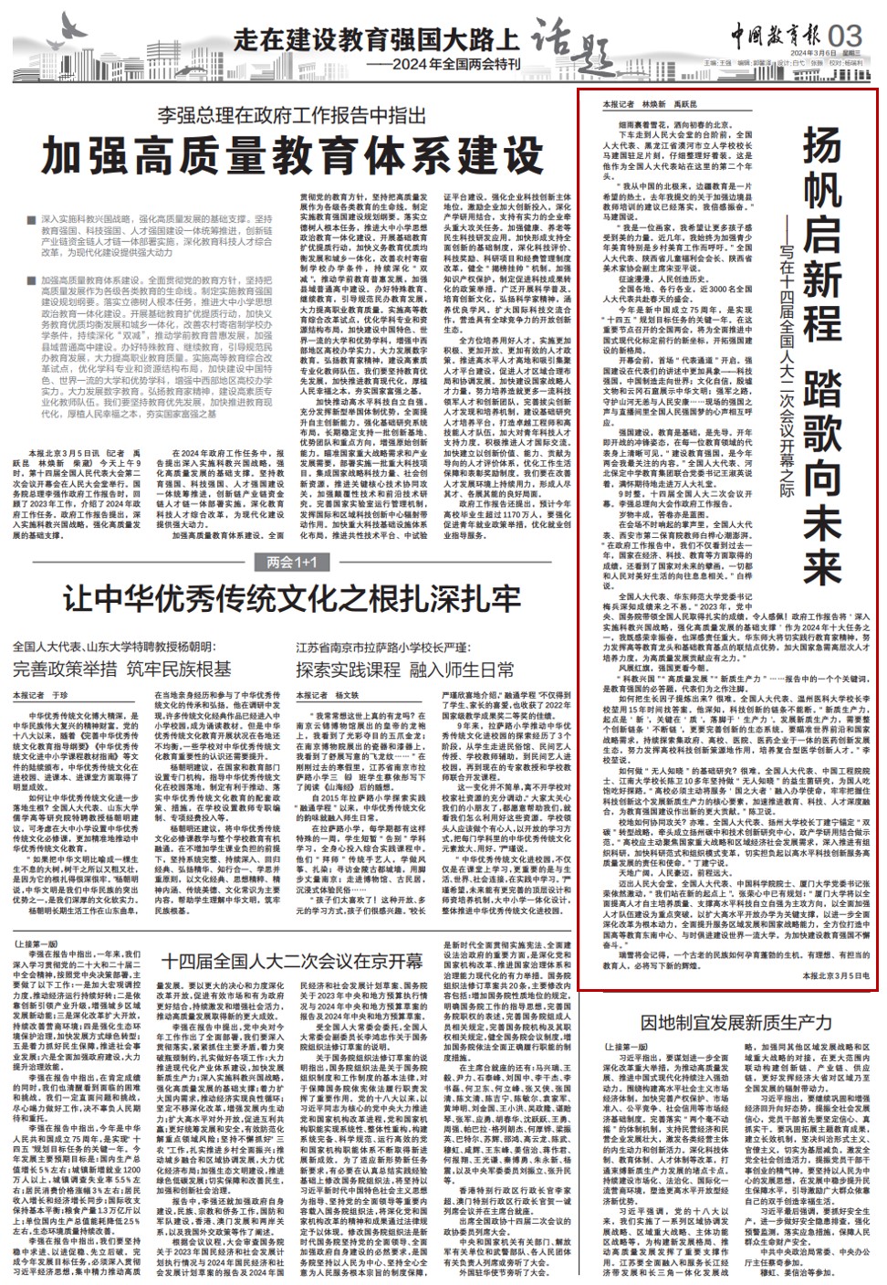 “科教兴国”“高质量发展”“新质生产力”……报告中的一个个关键词,是教育强国的必答题,代表们为之作注脚。
