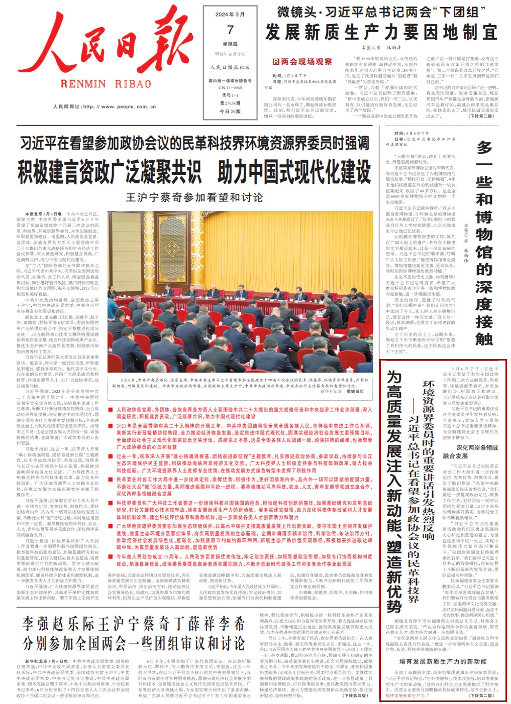 3月6日下午,习近平总书记看望了参加全国政协十四届二次会议的民革、科技界、环境资源界委员,并参加联组会,听取意见和建议。习近平总书记在认真听取大家发言后发表重要讲话。