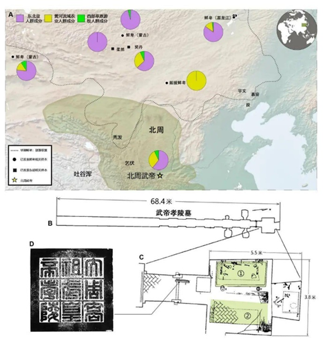 北周武帝宇文邕为鲜卑族,鲜卑人群的起源研究是历史学和人类学领域的重要课题。复旦大学、厦门大学联合陕西省考古研究院对北周武帝宇文邕墓出土人骨进行了DNA的科学分析,通过对武帝基因组进行分析,研究团队从遗传学角度揭示了宇文邕及其家族的族源,对理解鲜卑人群的起源意义重大。