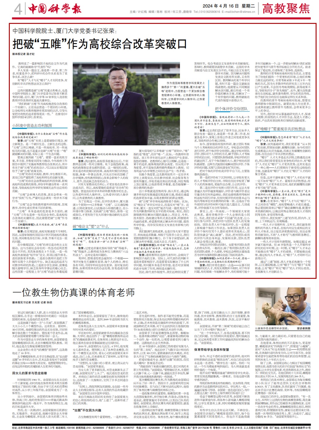 这些问题都是破“五唯”的重点和难点,也是中国科学院院士、厦门大学党委书记张荣不断思考的问题。近日,厦门大学等10家单位入选首批教育评价改革研究基地共建单位。
