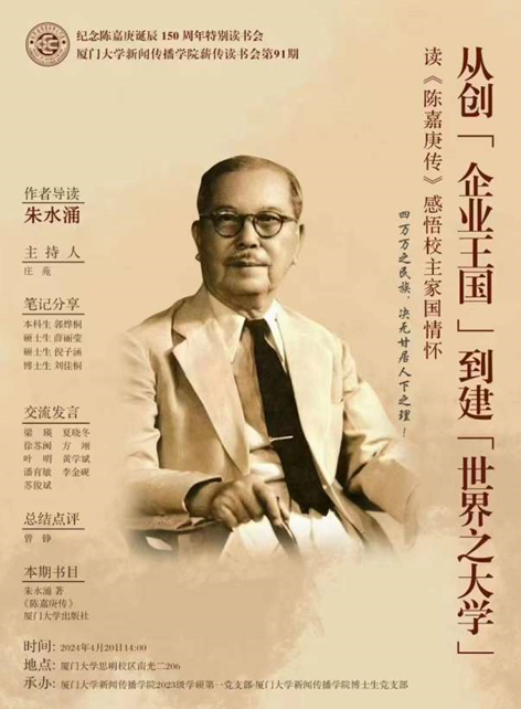 2024年是厦门大学校主陈嘉庚先生诞辰150周年,正值世界读书日来临之际,4月20日下午,“纪念陈嘉庚诞辰150周年特别读书会”在厦门大学思明校区南光二成功举办。本次读书会主题为“从创‘企业王国’到建‘世界之大学’:读《陈嘉庚传》感悟校主家国情怀”,大家从家国情怀、国际视野等多个维度分享了自己所理解的“嘉庚精神”,在交流对话中搭建起了人才培养的桥梁。
