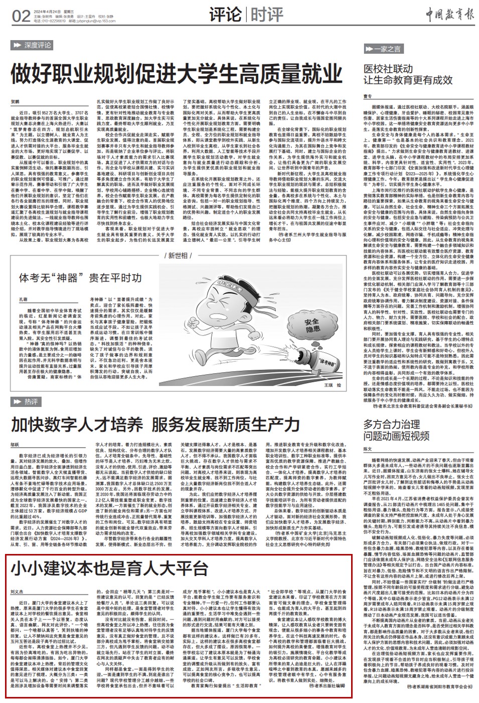 教育家陶行知曾提出“生活即教育”“社会即学校”等观点。从厦门大学的食堂建议本来看,印证了学校教育在方方面面皆可做文章的理念。学校食堂管理得当,也能成为育人的大平台,甚至起到四两拨千斤的教育效果。