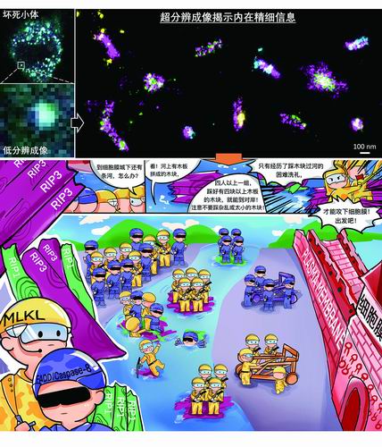 研究人员找到了一个精准的观察利器——STORM,并且用这一显微镜实现了对“坏死小体”在细胞中如何精准处理复杂信号进而决定细胞死亡命运的观察。他们发现死亡细胞中的“坏死小体”由初始点团样结构演化为规则的棒状结构的组装模式,并且在该规则棒状结构中呈现出明显的由RIP1/RIP3组成的马赛克状分布。当MLKL四个以上成团,找到四块以上RIP3木块,就能越过“坏死小体”河流,进而靶向细胞膜,导致细胞死亡。