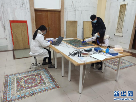 厦大历史学系师生团队对西安大兴善寺收藏的“二十一度母”唐卡进行无损检测。新华网发(受访者供图)