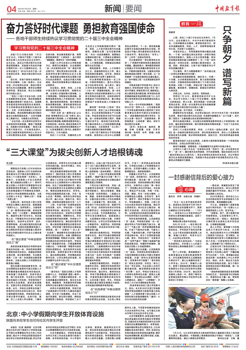 “党的二十届三中全会为进一步深化首都教育综合改革、推动首都教育高质量发展指明了前进方向。首都教育系统将坚持和加强党的全面领导,守正创新推动思政课建设内涵式发展,‘五育’并举夯实新质人才成长的坚实基础,高位统筹构建优质均衡的基本公共教育服务体系。”北京市委教育工委副书记、市教委主任李奕说。