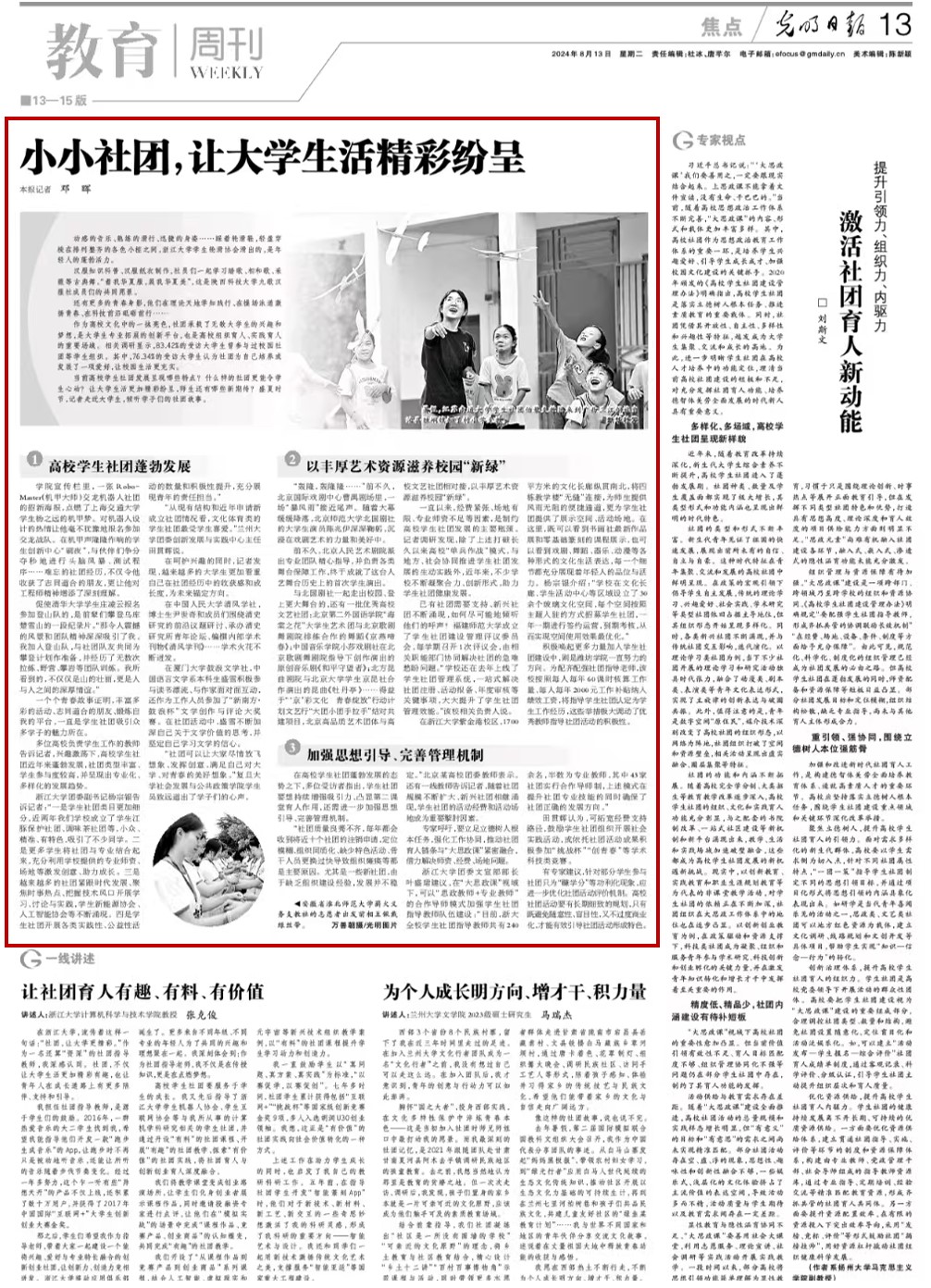 专家呼吁,要立足立德树人根本任务,强化工作协同,推动社团育人链条与“大思政课”紧密融合,借力解决师资、经费、场地问题。