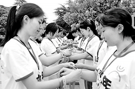 安徽省淮北师范大学薪火义务支教社的志愿者出发前相互佩戴绿丝带。万善朝摄/光明图片
