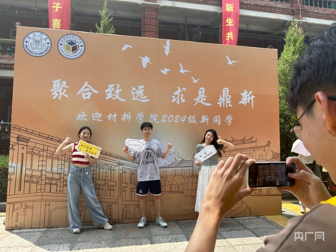 材料学院的研究生在迎新展板前留念(央广网记者 吴馨骅 摄)
