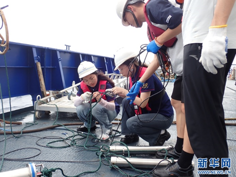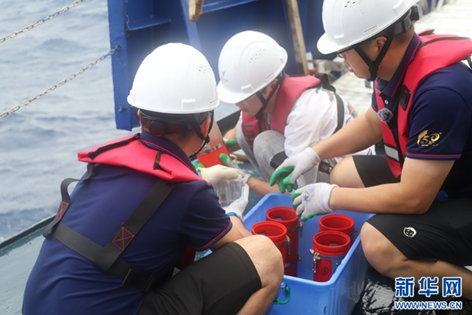 7月19日,浮游动物组的同学在老师指导下进行多联网样品的回收。新华网发(厦门大学供图)
