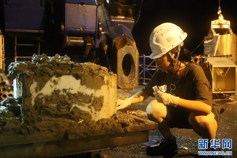 7月19日,底栖生物组戴言晨同学在对箱式采泥器收集到的表层沉积物进行取样,用于环境DNA/eDNA研究。新华网发(厦门大学供图)