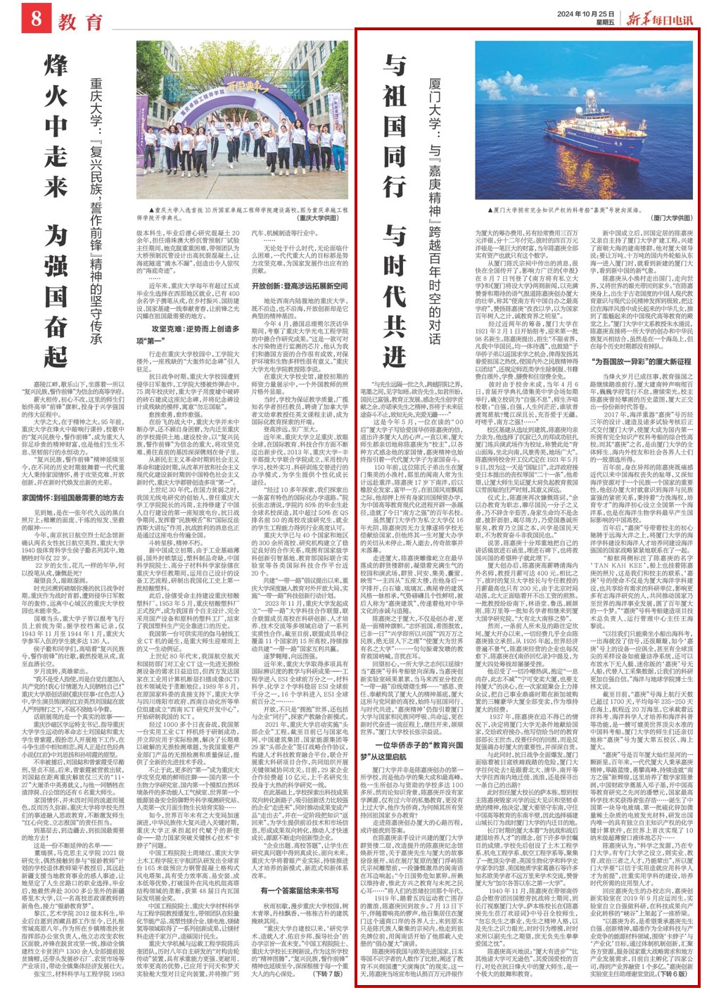 回望初心,一所大学之志何以延续?当“嘉庚”号科考船驶向深海,当嘉庚创新实验室硕果累累,当马来西亚分校在“一带一路”沿线熠熠生辉……“感恩、责任、奉献构筑了厦大人的精神基底,厦大这所与党同龄的高校,始终与祖国同行、与时代共进,‘嘉庚精神’仍指引着厦门大学与国家和民族同呼吸、共命运,更在新时代奋进一流征程上,继往开来,颉颃世界。”厦门大学校长张宗益说。