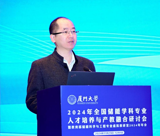 厦门大学党委常委、副校长尤延铖在开幕式上致辞。他表示,随着全球能源结构的转型升级和我国新型能源体系建设的推进,储能技术作为新型能源体系中的关键支撑,储能学科建设和人才培养的重要性和紧迫性日益显著。他强调,要以会议为契机促进我国储能学科专业建设与人才培养,加快助力储能领域“高精尖缺”人才培养,增强产业关键核心技术攻关和自主创新能力,推动高等教育与人工智能融合发展,联动构建产教融合协同育人新生态,为推动储能科学专业高质量发展、建设高水平科技强国的新征程贡献智慧和力量。
