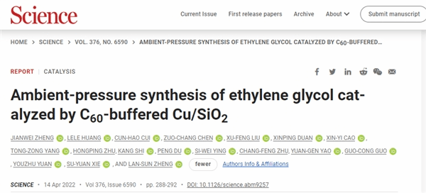 4月15日,相关研究成果以“C60缓冲Cu/SiO2催化乙二醇常压合成”为题,发表了在Science杂志上。Science还在同期配发专家点评文章,文中写道,“在目前已实现富勒烯工业化生产的大背景下,这一研究成果将在学术界和产业圈产生重要影响,并终将走向成熟”。
