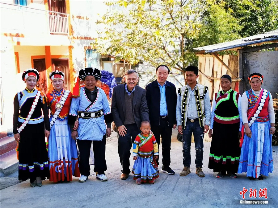 2019年第二次环游中国期间,潘维廉(左四)在云南与傈僳族居民在一起。受访者供图
