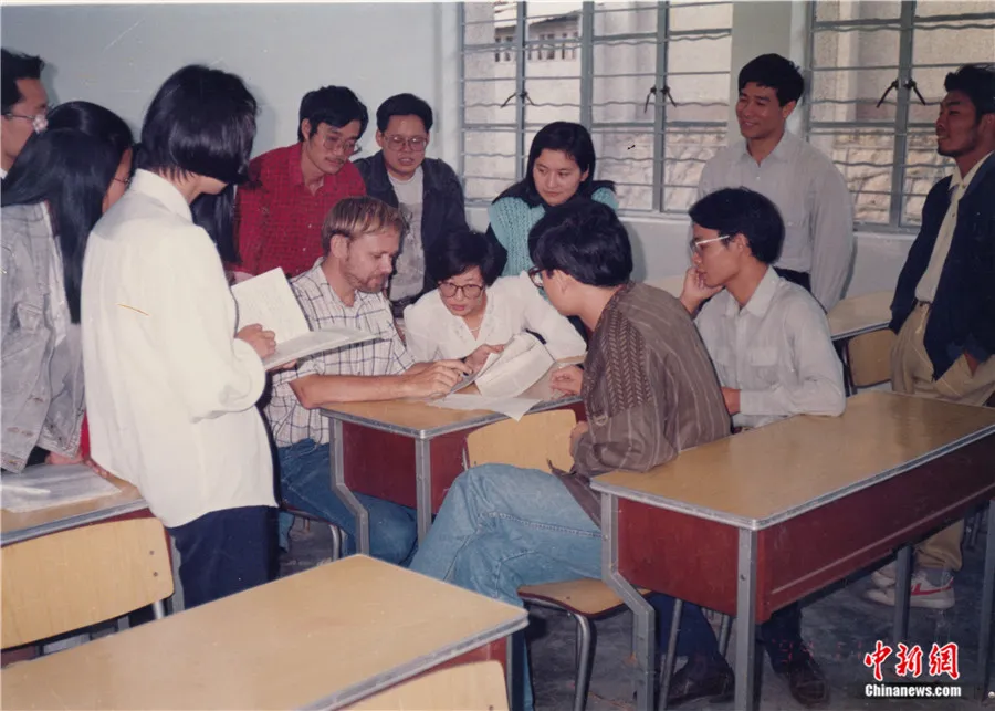 20世纪80年代末,潘维廉在厦门大学的课堂上与学生交流。受访者供图