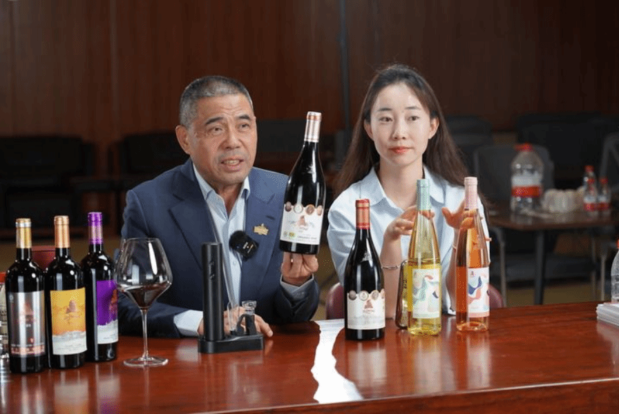 2025年6月18日,闽商陈德启在贺兰神酒庄的直播间展示销售葡萄酒。(永宁县委宣传部供图)