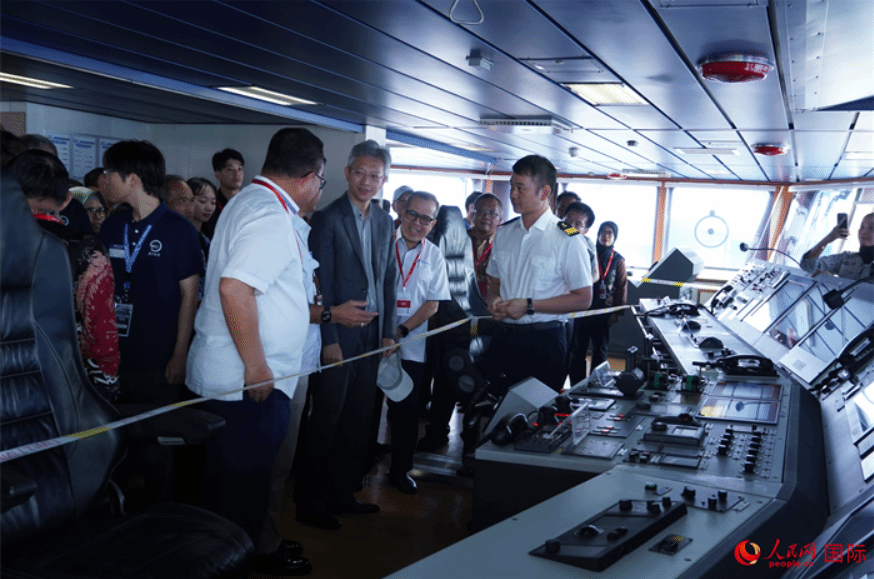 中国驻印尼大使王鲁彤等嘉宾参观“嘉庚”号科考船驾驶室。人民网记者 曹师韵摄