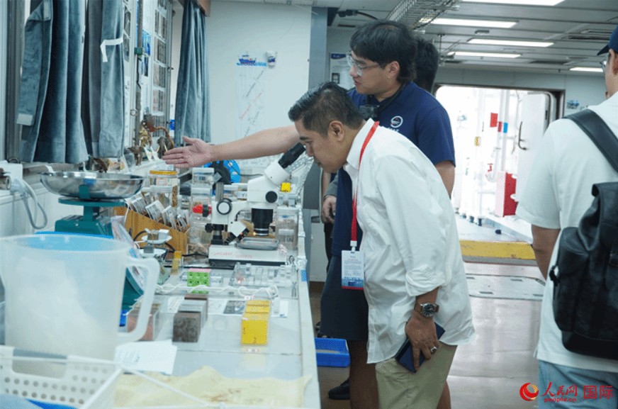 开放日当天,观众在“嘉庚”号科考船主实验室参观由师生从海底采集的科研样本。人民网记者 曹师韵摄