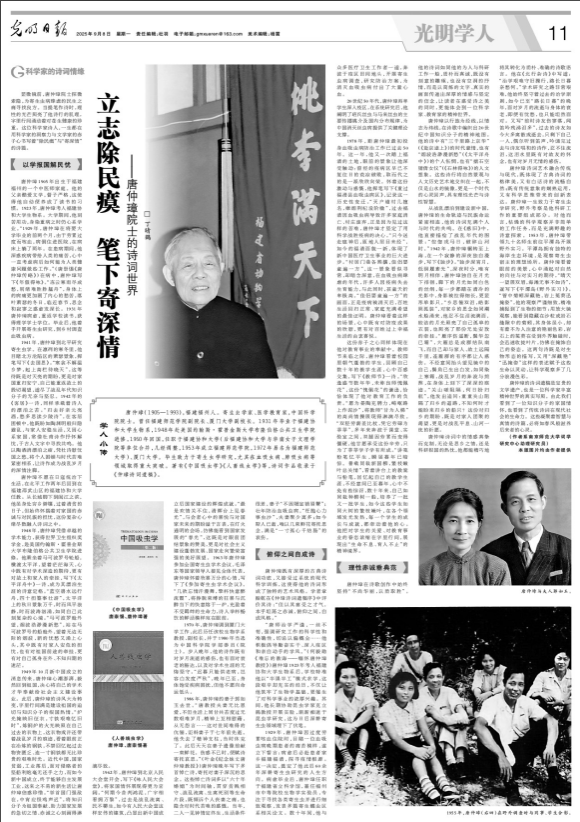 唐仲璋的诗词遗稿是宝贵的文学遗产,也是一位科学家丰富精神世界的真实写照。由此我们看到了一位知识分子的家国情怀,也看到了传统诗词在现代社会的生命力。这些凝聚着智慧与真情的诗篇,必将如春风般滋养后来者的心灵。