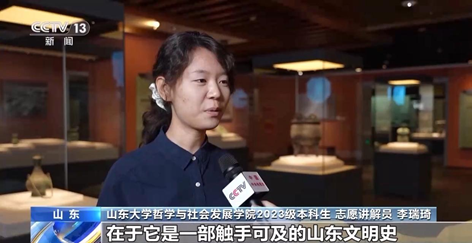 山东大学哲学与社会发展学院2023级本科生 志愿讲解员 李瑞琦:山东大学博物馆最吸引我的点在于它是一部触手可及的山东文明史,用最具代表性的器物来罗列山东历史文明发展的一个进程,让观众感受到海岱地区文明的魅力。